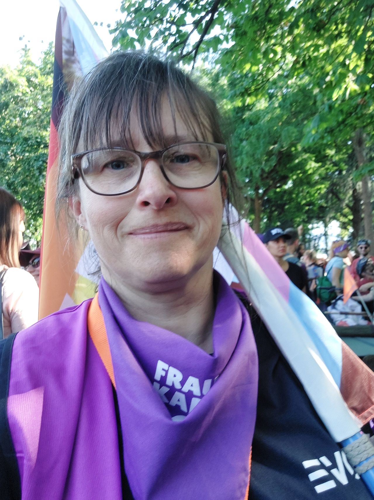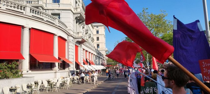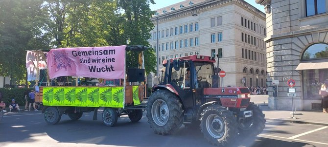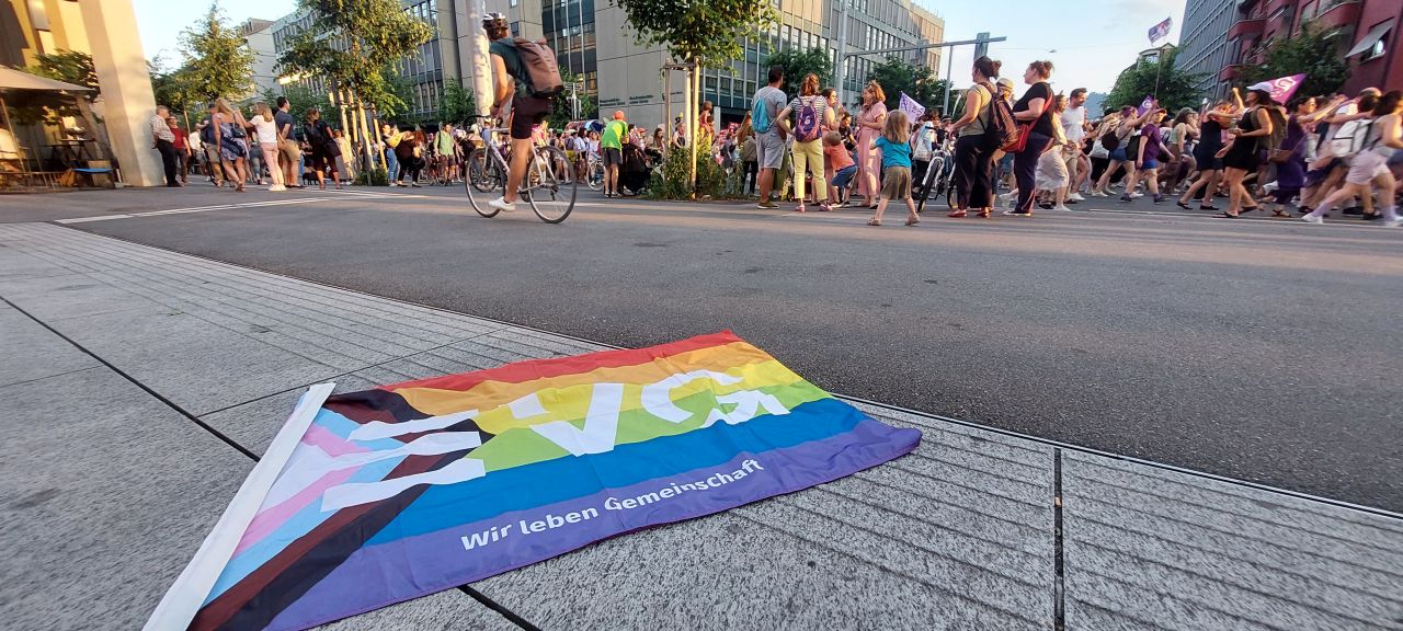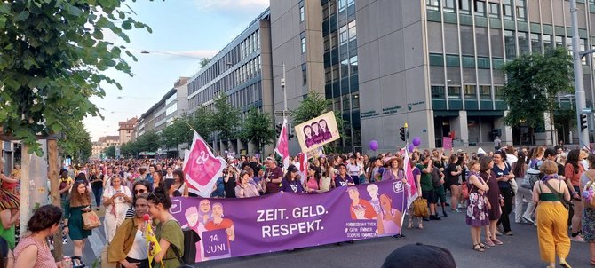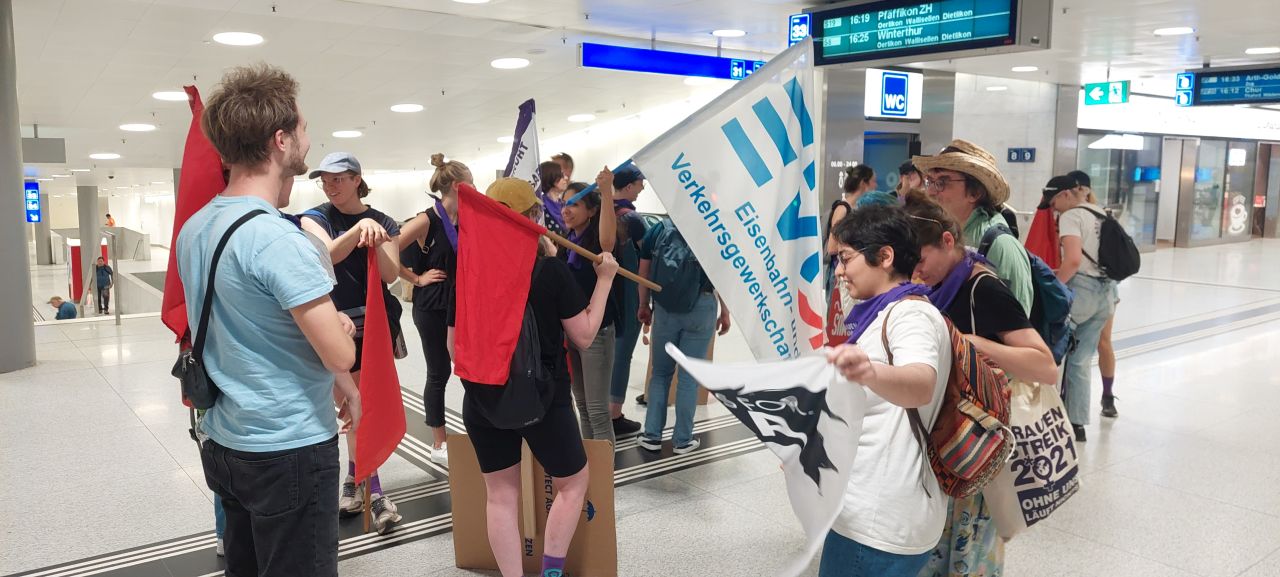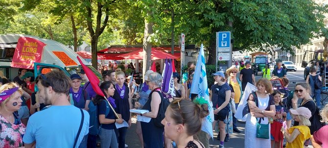 Parallel zu den Kolleg:innen der Gewerkschaften im Transportarbeiter:innenbereich (unter anderem der EVG) und des ETF („Women In Rail“), deren Vierländertreffen am 14.06.2023 in Bern stattfand, zeigten wir als EVG-Frauen Stuttgart und Aktionsbündnis 8.März unsere Solidarität vor Ort.