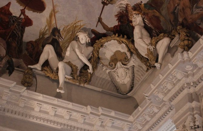 Immer wieder sind die Besucher: innen von dem weltberühmten stützenfrei überwölbten Treppenhaus mit dem Deckenfresko mit den vier Erdteilen von dem Venezianer Giovanni Battista Tiepolo begeistert und wurden vom Schlossführer über viele einzelne Darstellungen im Detail ausführlich informiert.