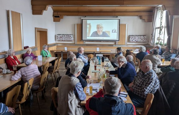 Danach folgte ein Novum: Zum ersten Mal wurde ein Referent online per Microsoft TEAMS zugeschaltet. Hans-Theo Jansen, der im Projekt „Digitale Teilhabe“ aktiv mitwirkt, informierte von seinem über 500 km entfernten Wohnort aus über die elektronische Patientenakte (ePA). Er stellte uns die ePA am Beispiel der ePA-App von der Bahn-BKK praxisnah vor und erläuterte die Funktionen. Dank seiner früheren Tätigkeit bei der Bahn-BKK und seiner großen Erfahrung erklärte er das Thema ruhig, verständlich und sehr anschaulich – genau richtig für unsere Seniorinnen und Senioren.
