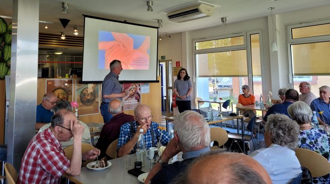 Nach einer guten Stunde bedankt sich der Seniorenleiter Huber bei Frau Guerra-Fischer für den Vortrag und für die Broschüren zum Thema mit einem Weinpräsent aus der Ortenau.