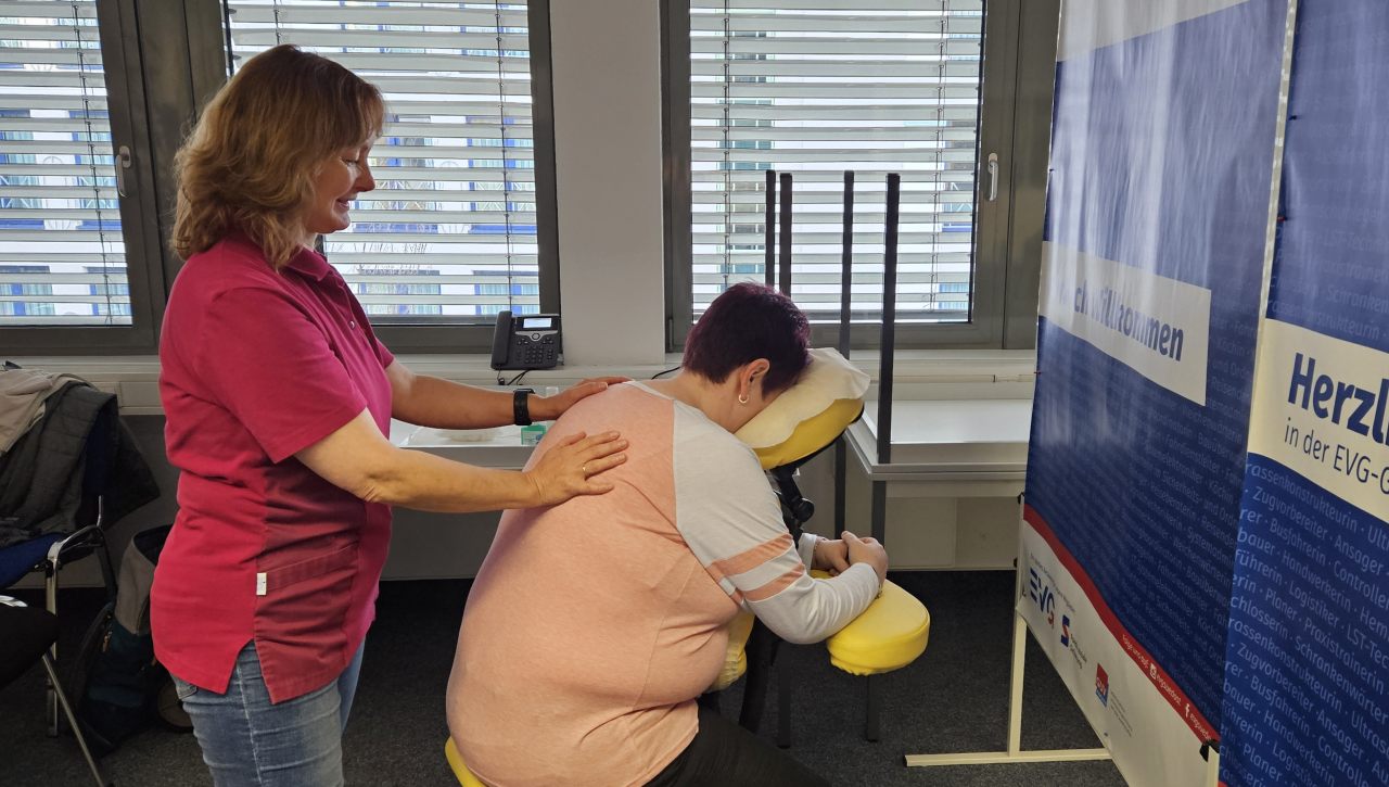 Neben den wohltuenden Massagen hatten unsere Teilnehmer:innen von Abellio, DB InfraGo, DB Regio und DB Services die Gelegenheit, sich über die umfassenden Leistungen der EVG und des Fonds soziale Sicherung zu informieren.