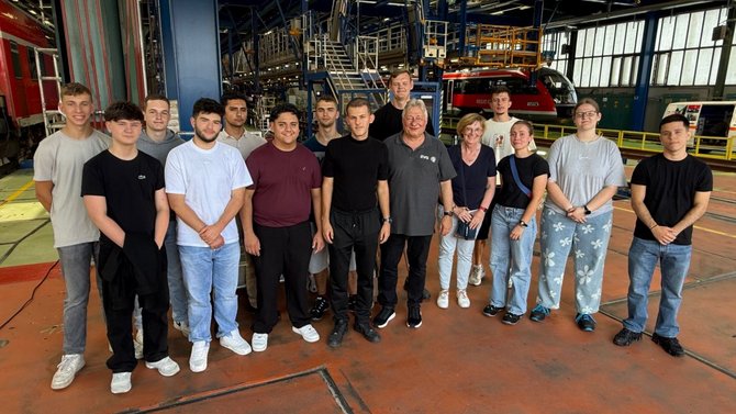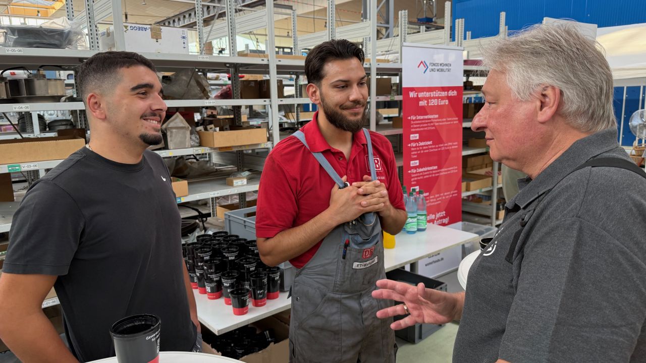 Derzeit gibt es 45 Auszubildende, darunter nur zwei Frauen. Zwei junge Kollegen kommen mit Martin Burkert ins Gespräch: Der eine war zuvor fünf Jahre in der Gastronomie tätig, der andere schon immer an Technik interessiert. Über ein Online-Portal der DB AG haben sie sich beworben – und wurden direkt eingestellt. Beide hoffen nun auf ein Übernahmeangebot.