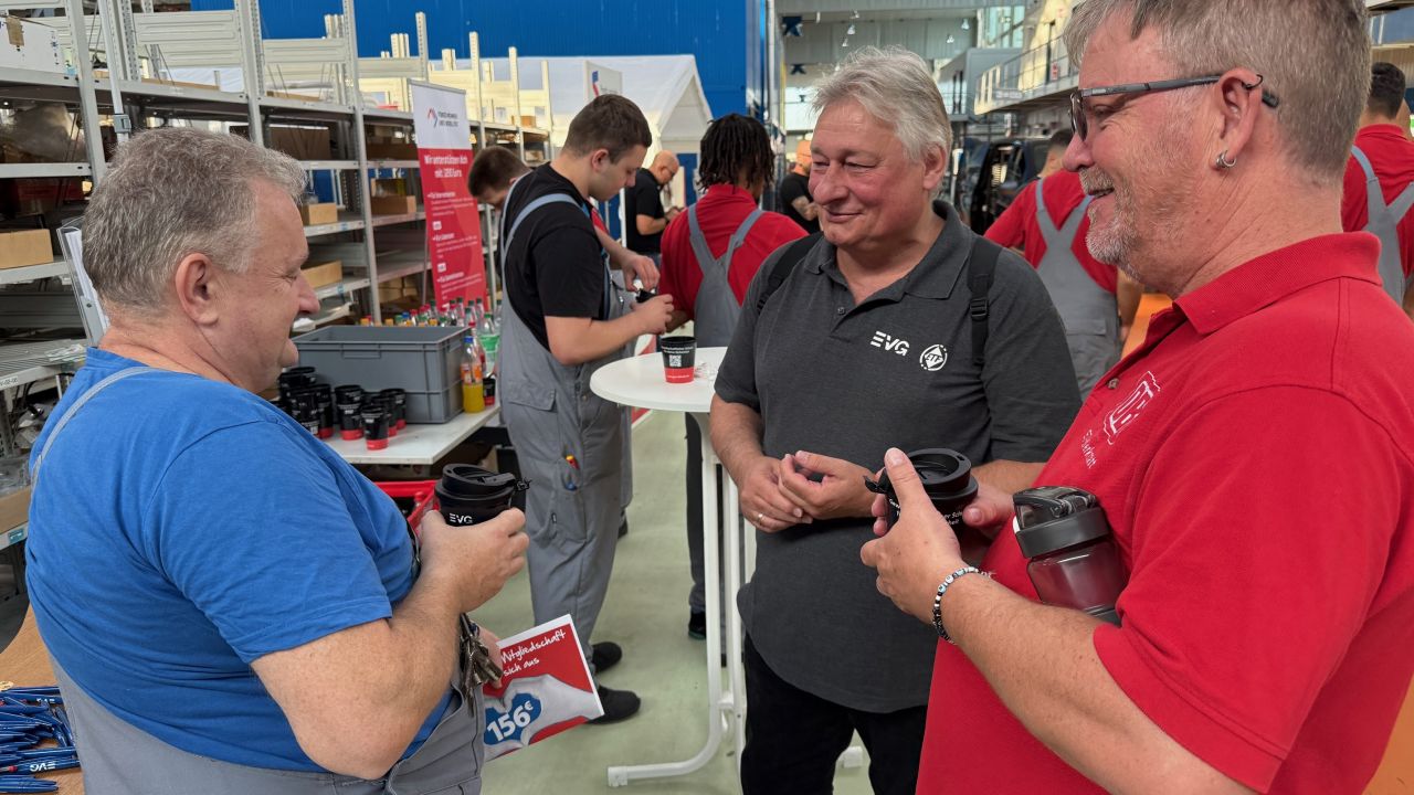 Die Kolleginnen und Kollegen sind - wie die des benachbarten Fernverkehrswerks - über die Mittagspause zum gemeinsamen Grillen mit EVG-Vorsitzendem Martin Burkert eingeladen. Beim Gang durch die Werkhallen stellt sich Annette Etschmaier-Vogt aktiv als Betriebsratsmitglied vor und lädt jeden ein, doch kurz vorbeizuschauen. Ein junger Kollege spricht sie an: Er habe seine Mitgliedsnummer vergessen. „Komm gleich vorbei, ich schreibe mir deinen Namen auf und melde mich dann bei dir“, ruft sie ihm zu. Der junge Mann strahlt: „Das mache ich“, antwortet er und ergänzt: „Dann kann ich endlich meine Fondsleistungen beantragen – Geld, das die EVG in der zurückliegenden Tarifrunde ausschließlich für ihre Mitglieder verhandelt hat.“
