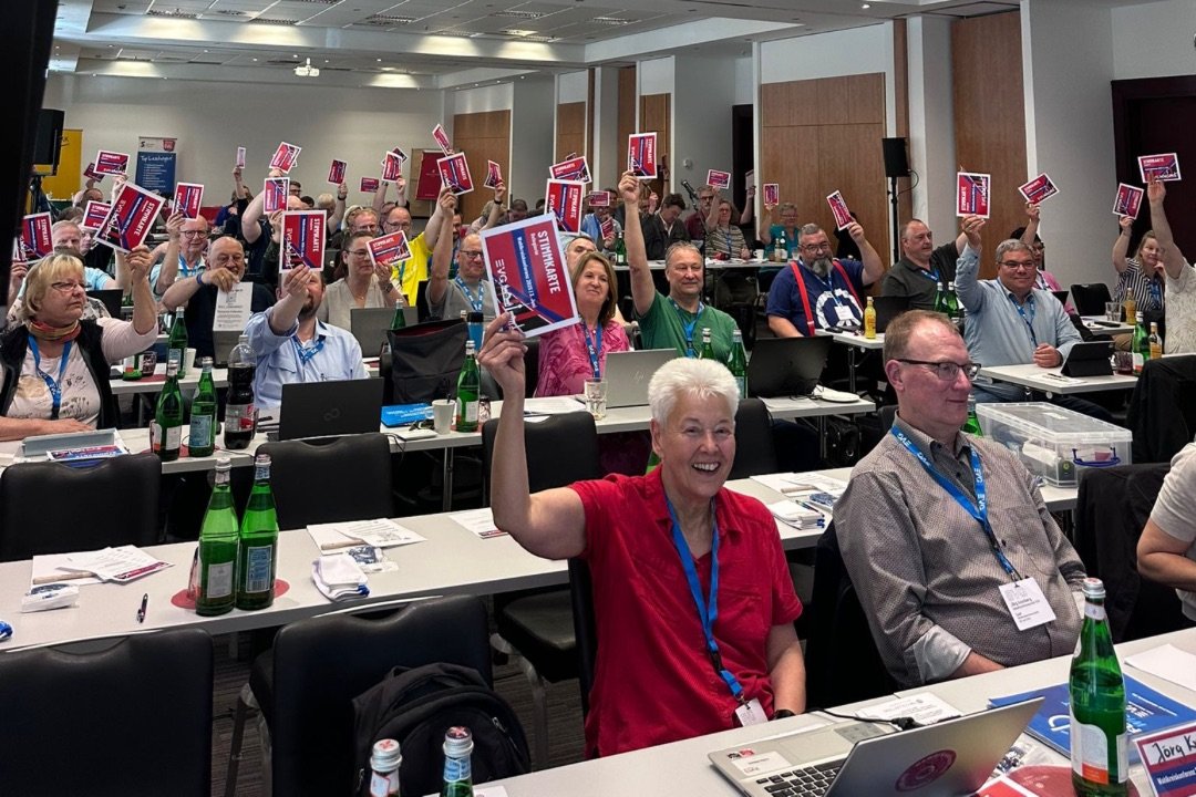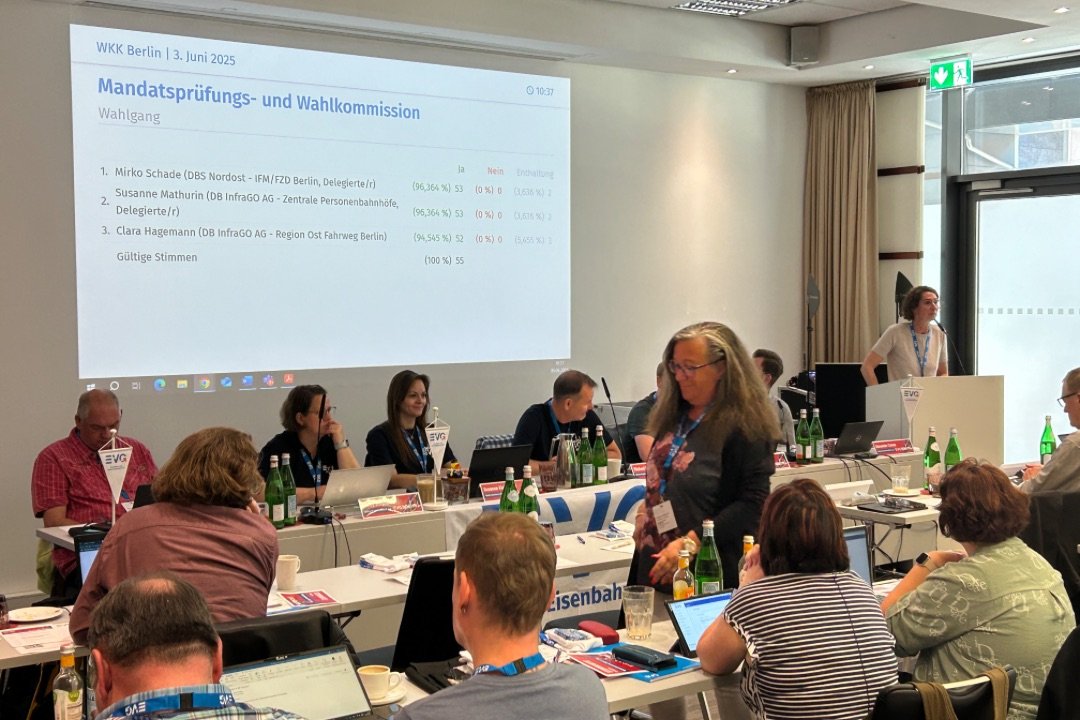 Zu einer Wahlkreiskonferenz der Berliner EVG trafen sich am 3. Juni die Delegierten in Berlin. Im Mittelpunkt stand die Weiterentwicklung der Strukturen und der Satzung unserer Gewerkschaft. Dazu hat der Bundesvorstand bereits ein Diskussionspapier erarbeitet, das im Vorfeld in den Betriebs- und Personengruppen der Hauptstadt-EVG breit diskutiert wurde. Das Papier enthält Vorschläge, wie die Arbeit unserer Gewerkschaft künftig ausgerichtet werden kann. Schwerpunkte sind hierbei die Verkleinerung von Gremien und eine gerechtere Verteilung von Mitgliedsmitteln. EVG-Vize Cosima Ingenschay stellte sich in der Veranstaltung der konstruktiven Diskussion.