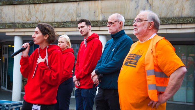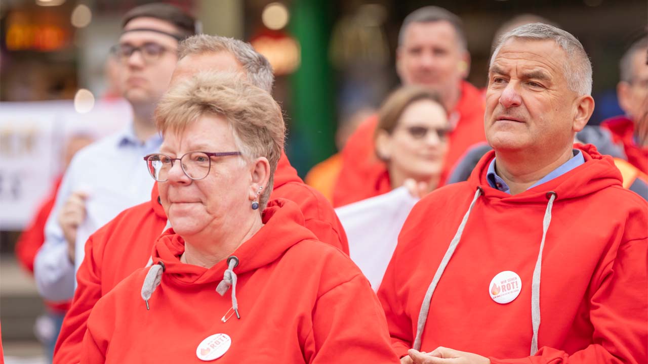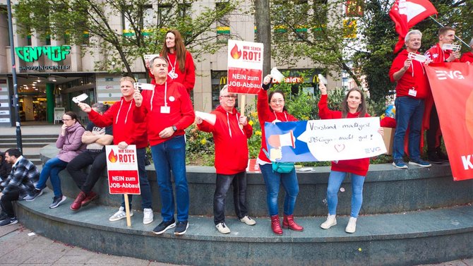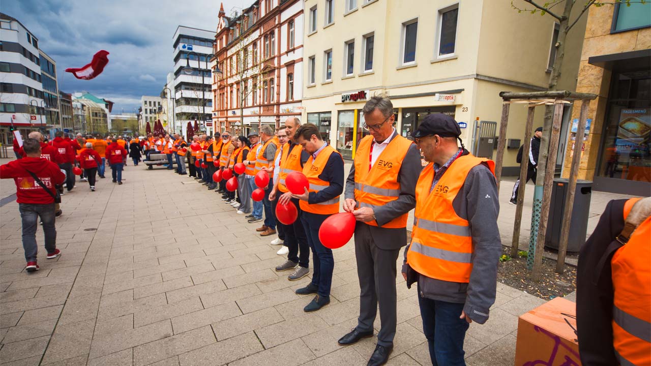 Der „große Kehraus“, er wurde in Fulda schon mal vorgezogen. Mit groben Besen wurde „der Vorstand“ weggefegt, unter donnerndem Applaus der Anwesenden. Die hatten zuvor die umstrittenen Pläne von Sigrid Nikutta „platzen“ lassen: Alle Betriebsrätinnen und Betriebsräte hatten spontan eine mehrere hundert Meter lange Menschenkette quer durch die Innenstadt von Fulda gebildet. Jeder hielt einen roten Luftballon in der Hand; diese wurden, einer nach dem anderen, zum Platzen gebracht. „Damit machen wir deutlich, was wir von den Ideen halten, die derzeit auf dem Tisch liegen, erklärte der Vorsitzende der örtlichen Betriebsgruppe, Alexander Göttlicher.