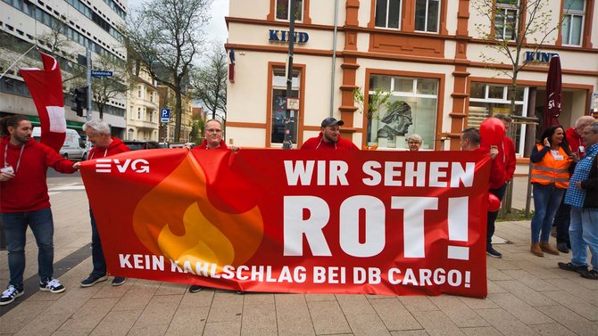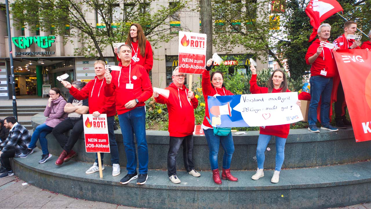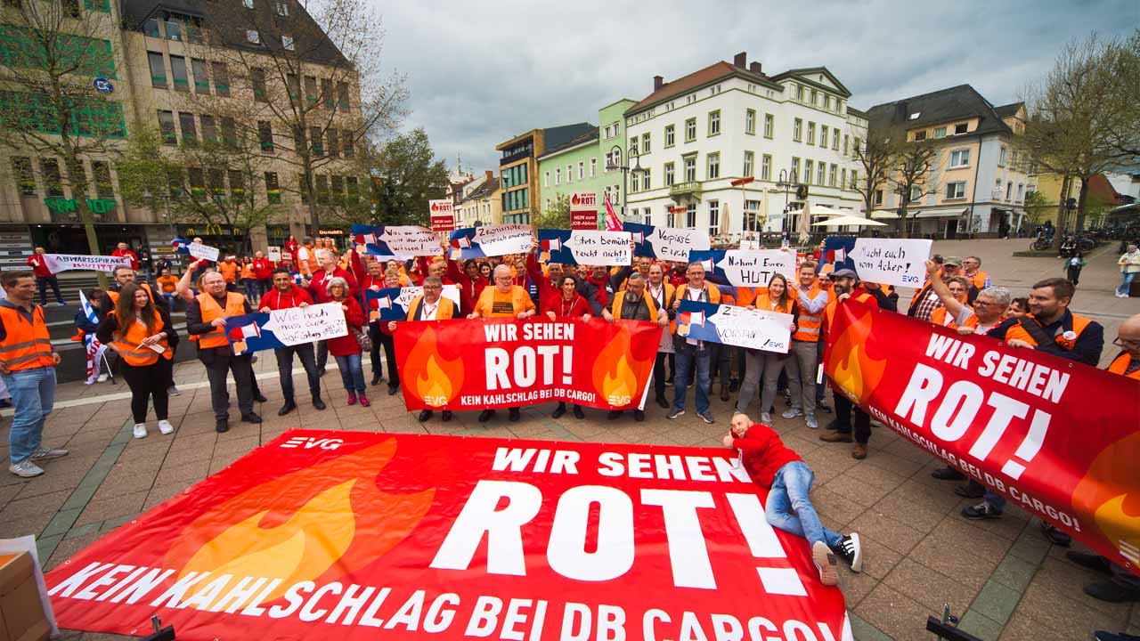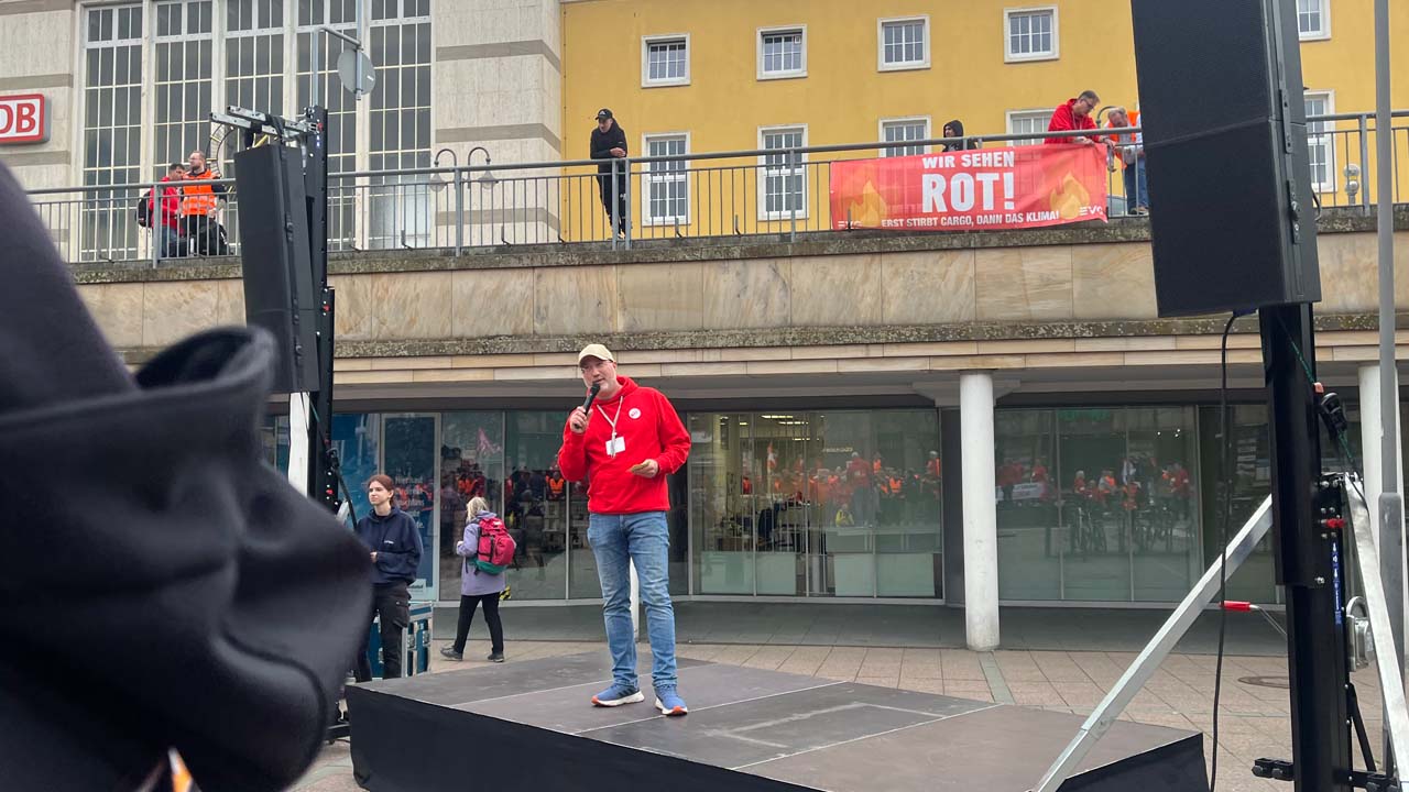 Seit Jahren schreibt DB Cargo rot Zahlen. Eine umstrittene Umstrukturierung soll jetzt die Wende hin zu profitablen Angeboten bringen. Doch die Betriebsräte sehen darin keine Perspektive, sondern eher die Zukunft des gesamten Unternehmens gefährdet. Die Sorge vor einer ungewissen Zukunft teilen dabei nicht nur die Beschäftigten bei DB Cargo selbst, sie ist im ganzen Unternehmen spürbar. Aus diesem Grund nahmen auch zahlreiche Betriebsräte von DB Regio an der Protestkundgebung in Fulda teil. Beide Mitbestimmungsgremien - der Gesamtbetriebsrat von DB Cargo, wie auch der Gesamtbetriebsrat von DB Regio - kamen am Dienstag zu einer turnusmäßigen Sitzung in Fulda zusammen. Mit dem gemeinsamen Protest machten sie deutlich, dass EVG-Betriebsräte solidarisch zusammenstehen und gemeinsam für die Interessen der Beschäftigten eintreten.