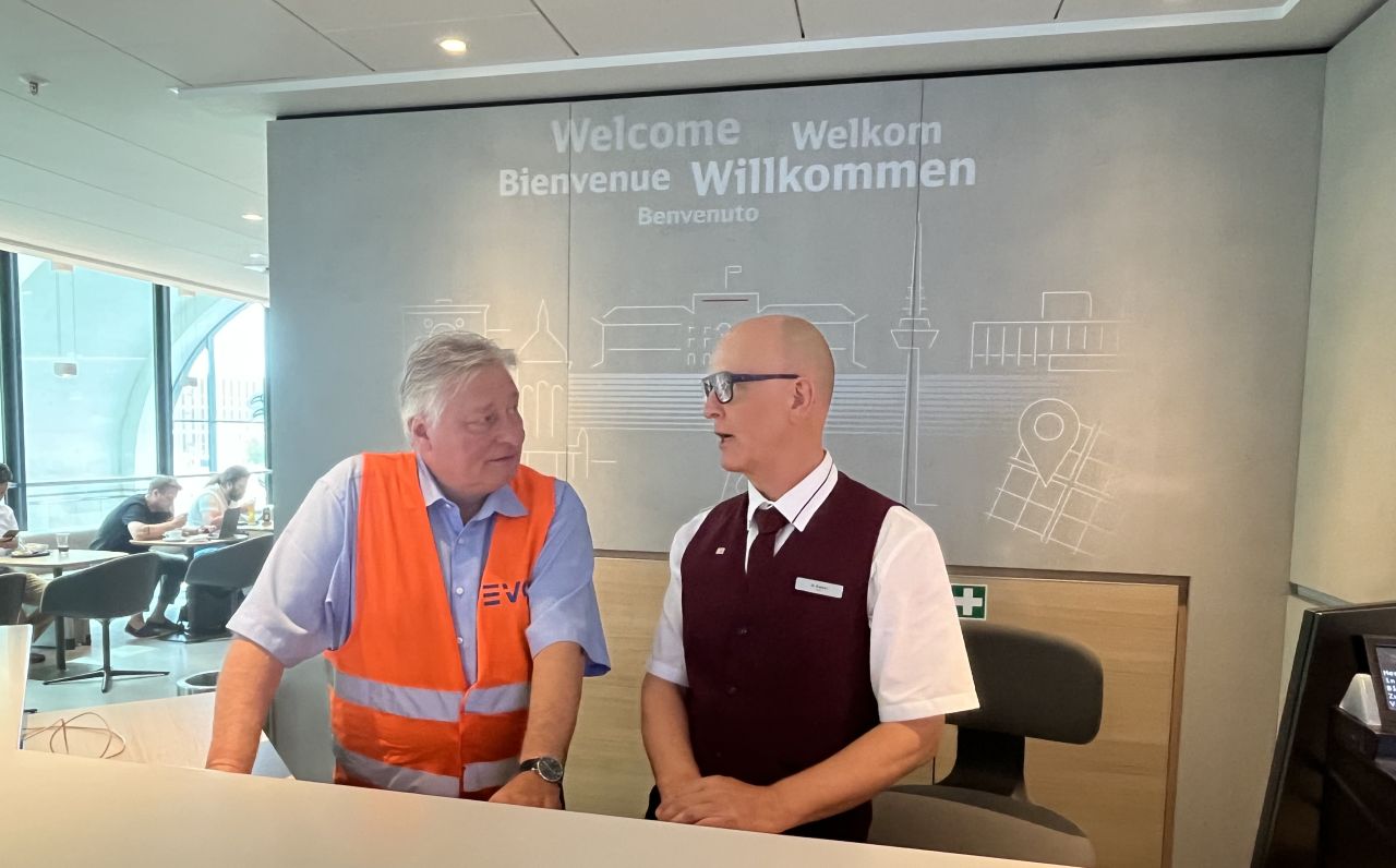 Das könnte nun ein gutes Schlusswort sein. Da wir aber noch Zeit haben, gehen wir noch einmal in den Hauptbahnhof. Die Kolleg:innen in der Lounge sind überrascht und erfreut über den Besuch. Hier werden, wenn auch nicht ganz einfach zu finden, Erste-Klasse-Kunden bewirtet. Es herrscht angenehmes Klima, nicht nur was die Raumtemperaturen, sondern auch was die Kollegialität betrifft. Probleme mit den Kunden? Der Kollege am Empfang, die Freundlichkeit in Person, winkt ab. „Ich war 34 Jahre im Zugbegleitdienst, ich kann mit solchen Situationen umgehen.“ Die aber ganz selten sind, die DB Sicherheit habe er noch nie rufen müssen. „Es ist mit den Kolleg:innen und auch mit den Gästen eigentlich wie eine große Familie.“ Auch ein gutes Schlusswort!