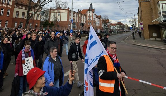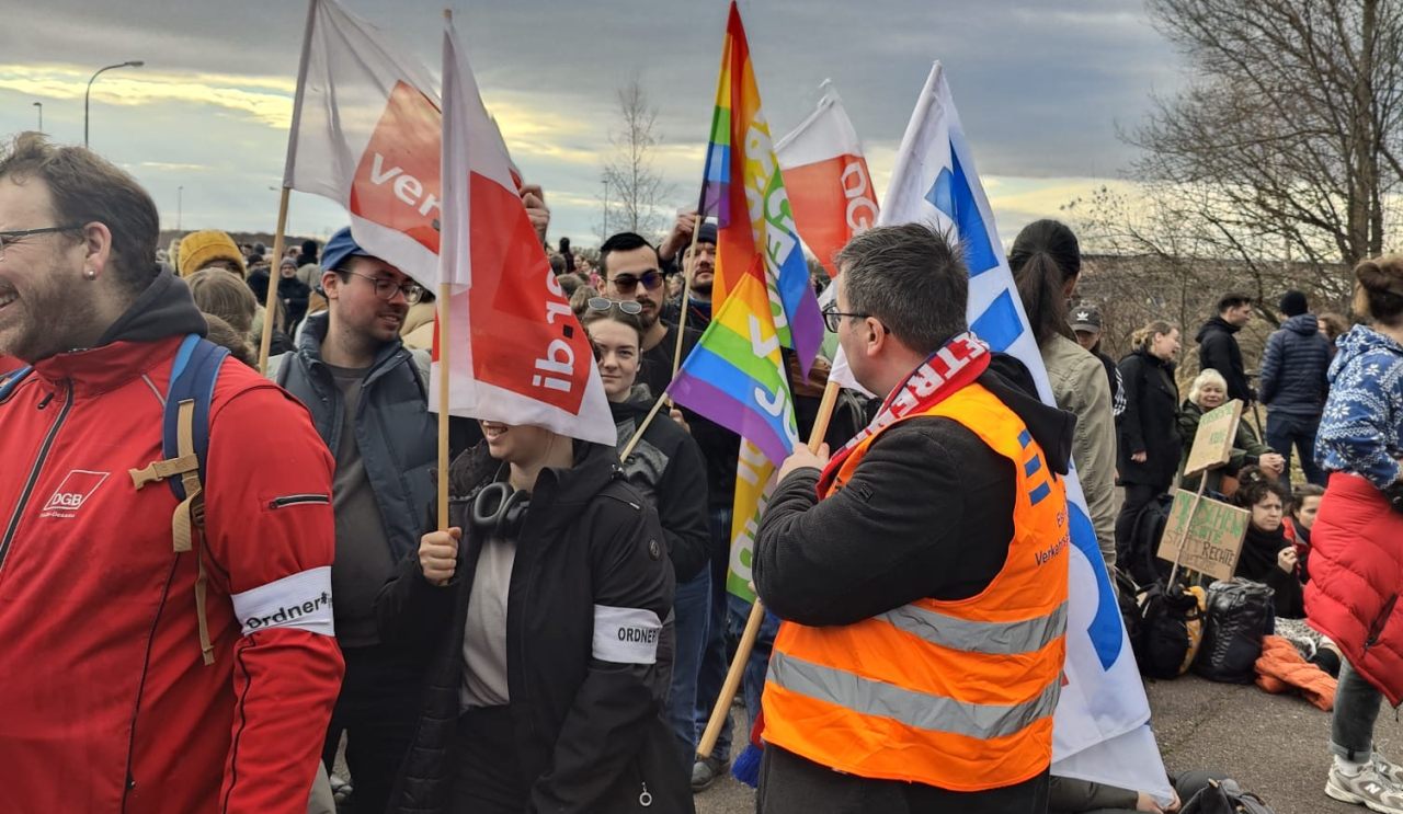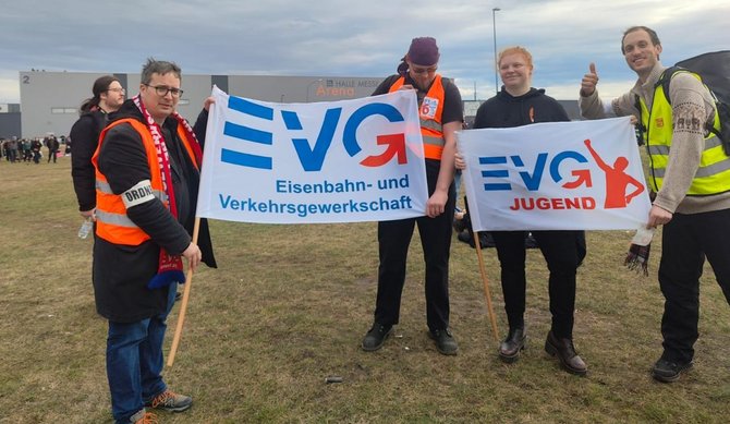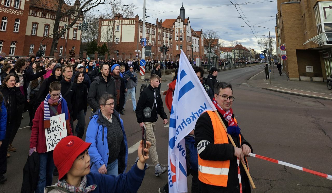 Unter den Demonstrierenden waren auch viele Gewerkschafter:innen. Der EVG-Ortsverband Halle war mit dabei und zeigte Haltung. David Dvořák, Vorsitzender des Ortsverbands Halle, erklärte: