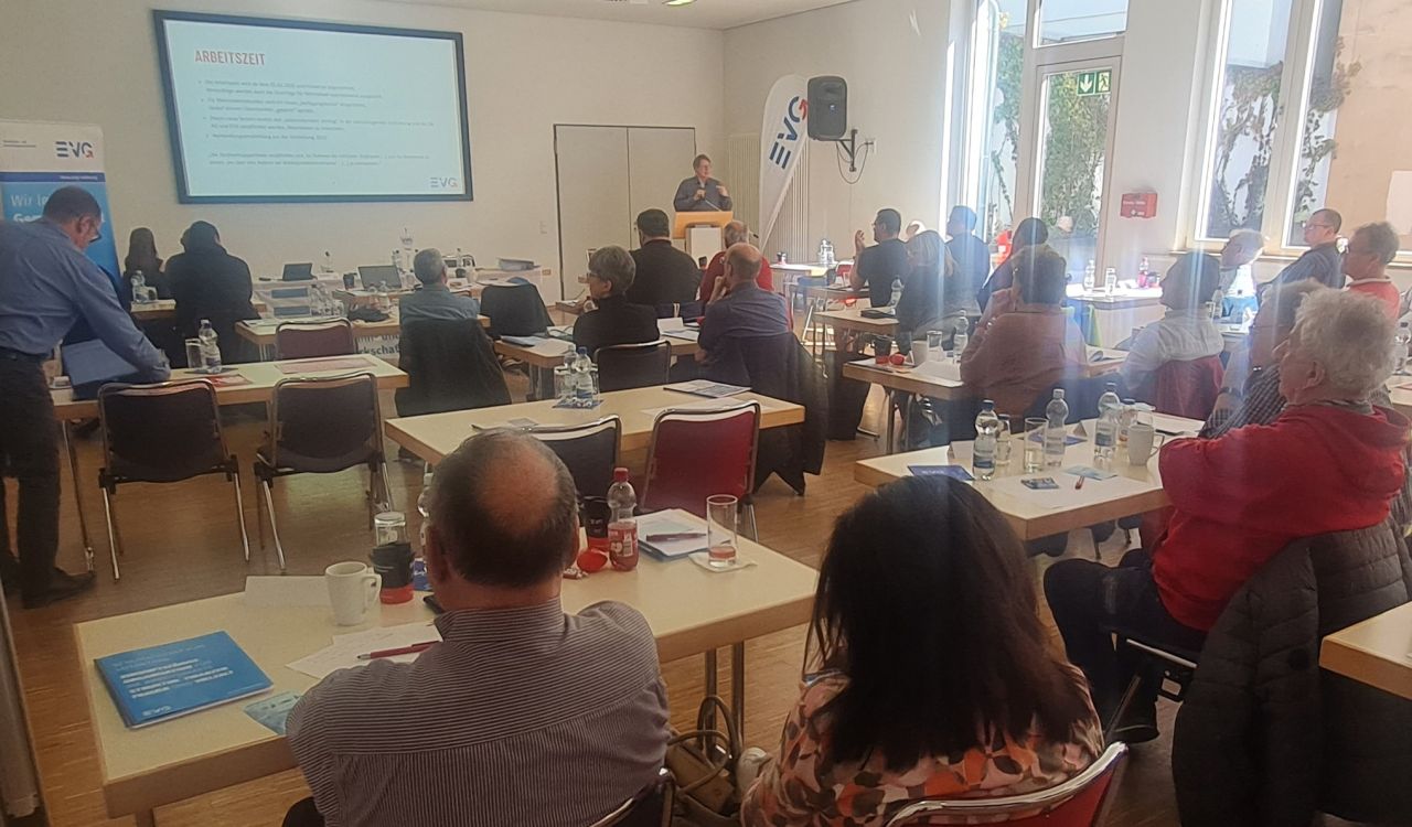 Bärbel Mauch, Regionsgeschäftsführerin des DGB, steuerte weitere Grußworte bei. Anschließend übernahm der stellvertretende EVG-Vorsitzende Kristian Loroch: In einem detailreichen Vortrag gab Kristian Einblicke in das Ergebnis der letzten Tarifverhandlungen im DB Konzern, beleuchtete politische Entwicklungen und erläuterte Neuigkeiten rund um den DB-Konzern.
