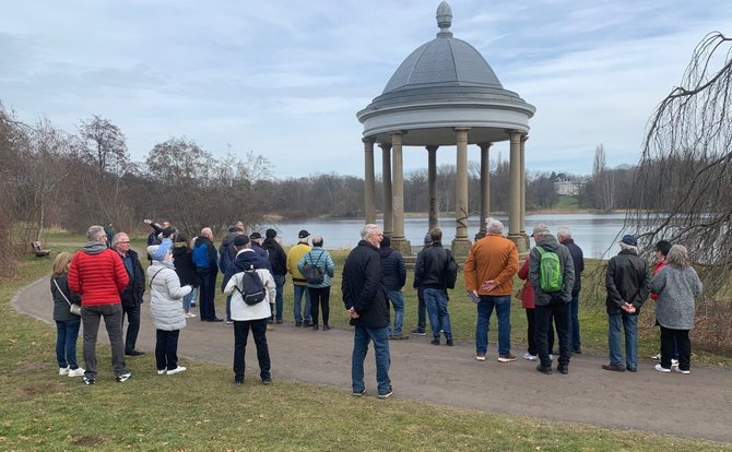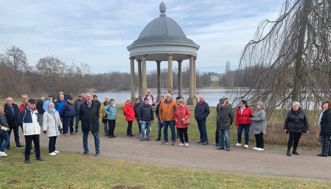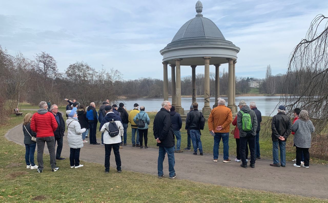 Am Schloss Richmond ging es bei sonnigem Wetter durch den schönen Bürgerpark. Unser Wanderführer Hermann Heyne unterhielt uns zwischendurch mit historischen und eisenbahnspezifischen Geschichten aus Braunschweig.
