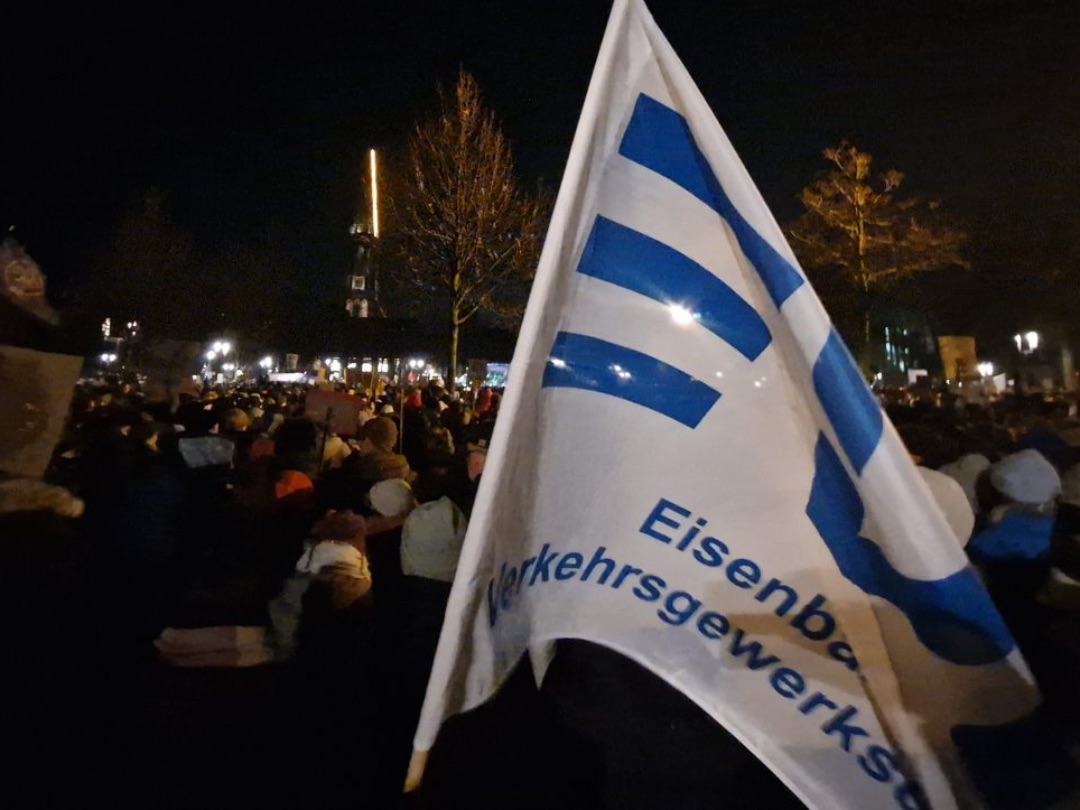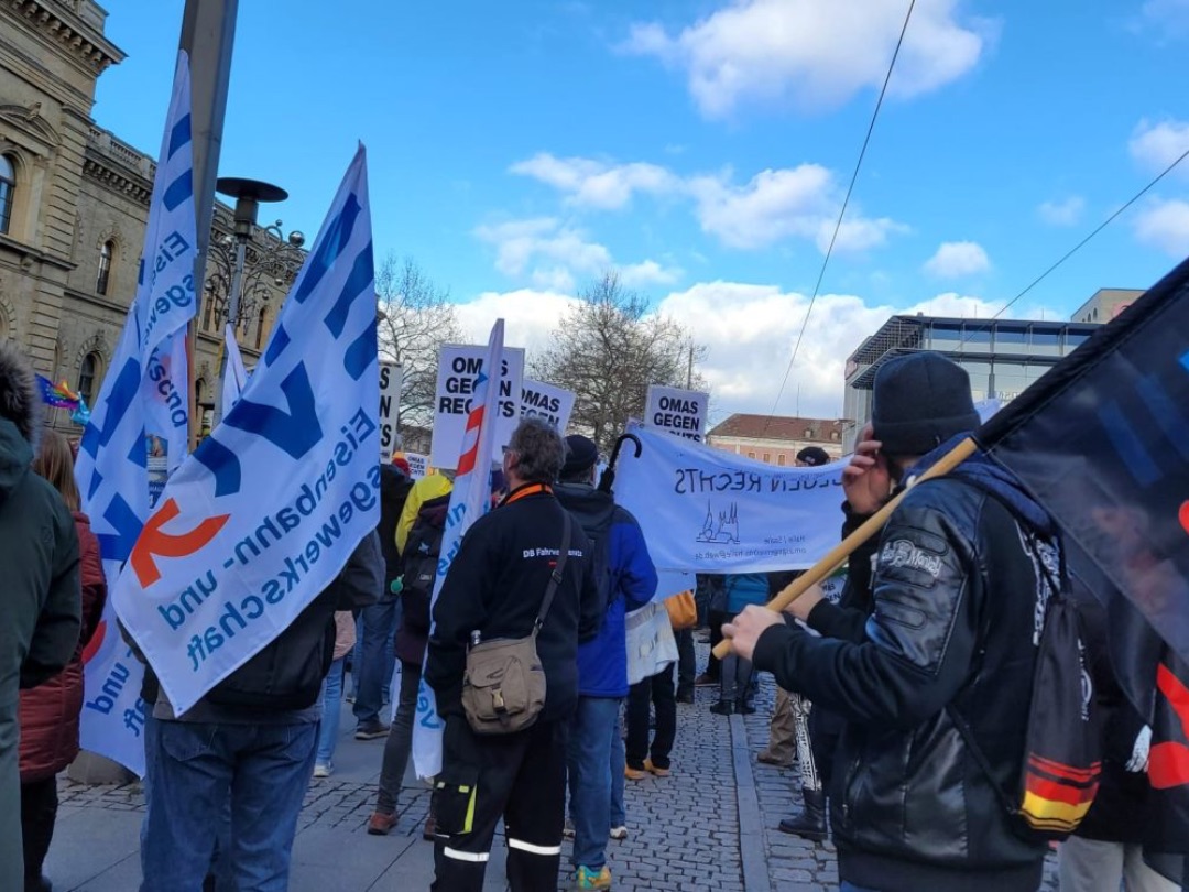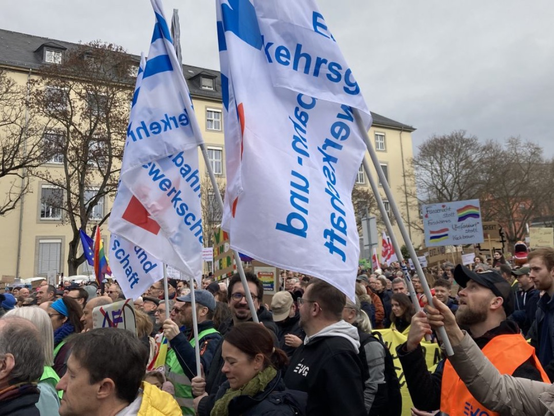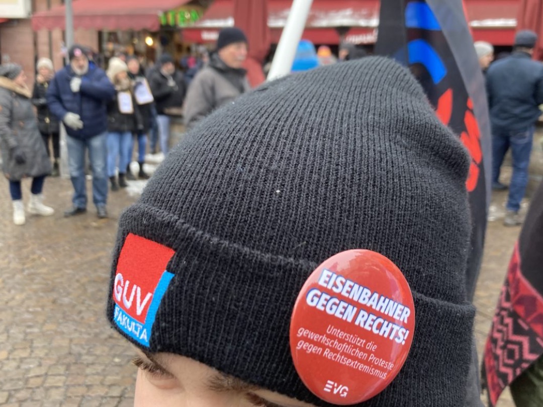 Und Mirko Schade, Betriebsrat bei DB Services, ist „heute hier, um Gesicht zu zeigen - gegen die AfD, gegen Rassismus, gegen Menschenfeindlichkeit. Und ich hoffe, dass sich viele Menschen an den anstehenden Wahlen beteiligen und ihr Kreuz gegen Rechts machen." Die bestürzenden correctiv.org-Enthüllungen zum konspirativen Treffen von Rechtsextremen und AfD-Politiker:innen erinnern an das dunkelste Kapitel der deutschen Geschichte.