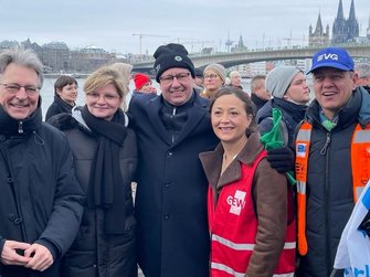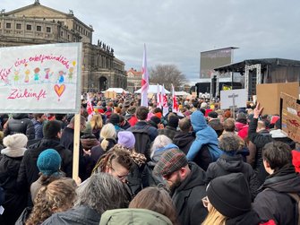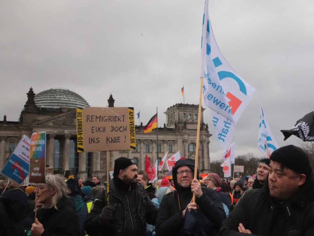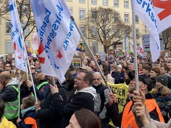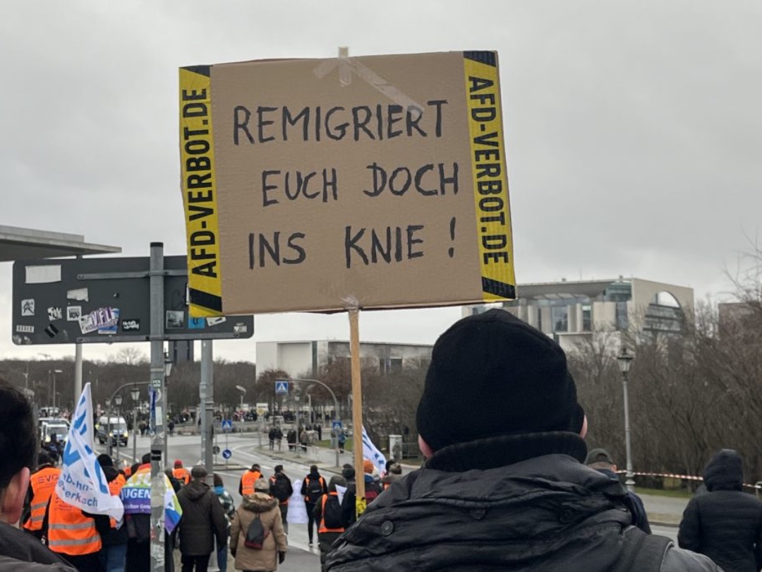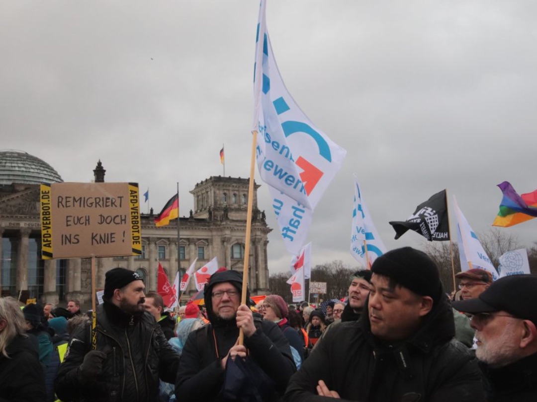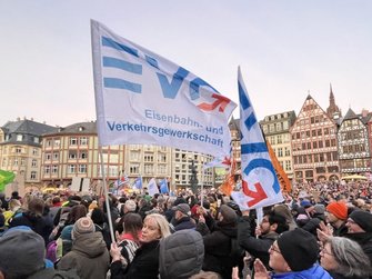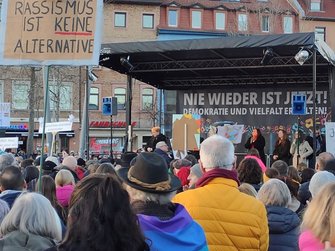 Und Mirko Schade, Betriebsrat bei DB Services, ist „heute hier, um Gesicht zu zeigen - gegen die AfD, gegen Rassismus, gegen Menschenfeindlichkeit. Und ich hoffe, dass sich viele Menschen an den anstehenden Wahlen beteiligen und ihr Kreuz gegen Rechts machen." Die bestürzenden correctiv.org-Enthüllungen zum konspirativen Treffen von Rechtsextremen und AfD-Politiker:innen erinnern an das dunkelste Kapitel der deutschen Geschichte.