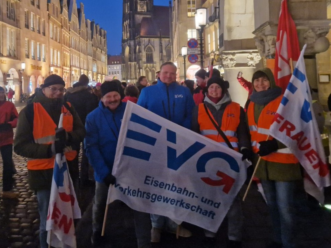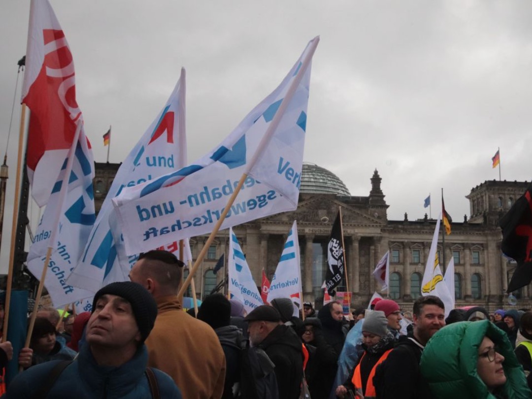 Von einem „tollen Zeichen“ spricht Berlins EVG-Landesvorsitzender Michael Bartl. „Wir stehen hier vor dem Reichstag. Vor noch nicht langer Zeit haben einige Spinner versucht, den Reichstag zu stürmen. Und es ist wichtig, dass so viele Menschen hier stehen und sagen: Wir sind das Volk, und nicht diese kleine Splittergruppe.“
