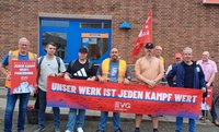 Während dort die Geschäftsführung mit der Werksleitung zu Gesprächen zusammengekommen war, standen rund 100 Kolleginnen und Kollegen vor dem Werkstor mit Banner und Fahnen Spalier.